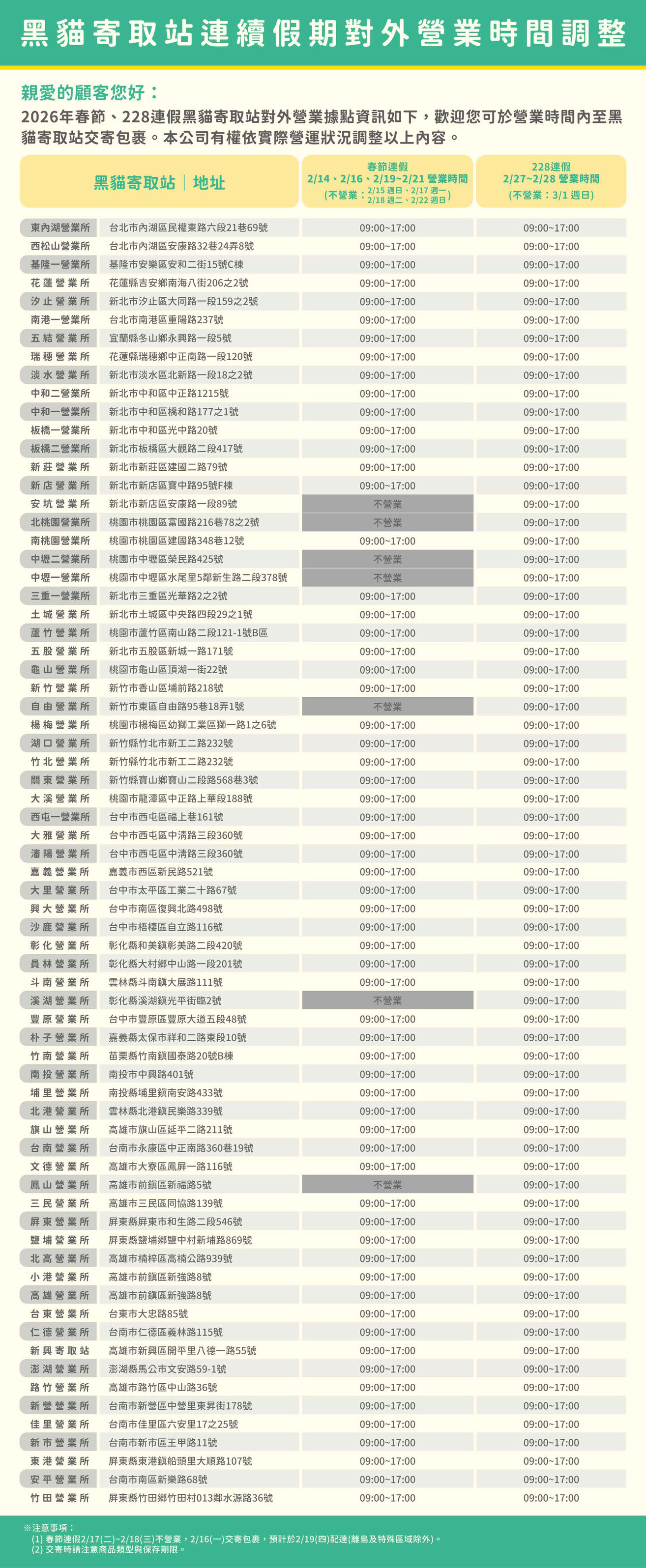 黑貓宅急便 2026年春節、228連假營業站所營業時間公告