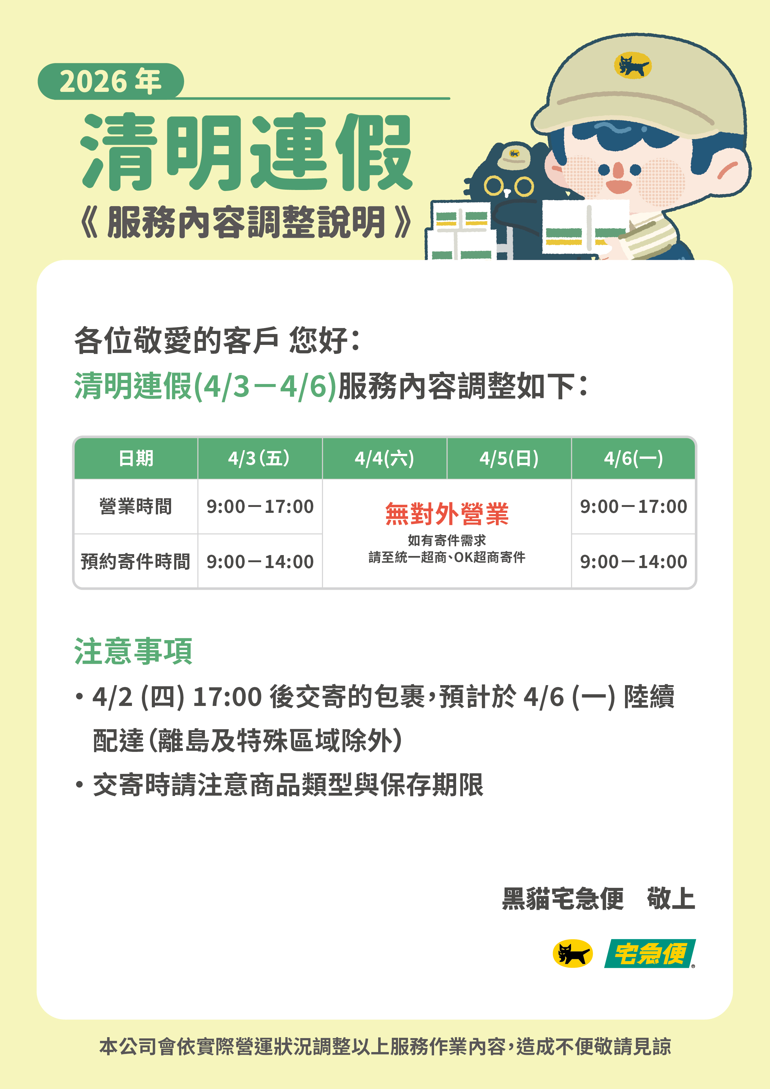 黑貓宅急便 2026年清明連假營業內容調整說明